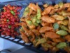 The peppers in this photo look rather intimidating something you wouldn't want to try and just pop in your mouth yet looks can be deceiving. The orange ones are called habanada it's a no heat habanero and the red ones are called sweet bonnet. It's also A no heat pepper.
