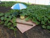 The older leaves look very bad after the hail storm and seemed to have taken the most damage. I am leaving the leaves for now as I feel I am still getting something out of the leaves even if it is not much. Other than the hail damage things are going as well as I have my chosen pumpkin on each plant with mill fabric and sand under each with some new umbrellas over top.