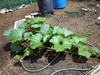 DAP 16 - readjusted the shade shelter to cover more of the plant and fruit. Need to bury more vines this evening. Sprayed with Sevin and Daconil since I already saw downy mildew in neighboring gardens. Very windy today and temps are on the move down this evening! Not much rain, so I need to haul some water.