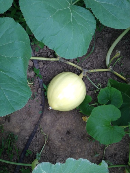 Jill wanted to take care of her own plant this year so I am showing her the ropes. I gave her a 1211.5 McCracken plant which looked great when it was little then developed a really bad ribbon vine. We terminated the main then trained a nice secondary to become the new main. Meanwhile we pollinated this one 12 days ago on the first side vine. It's now 32 inches around and looking good. She's also got a new pollination on the new main as a backup but will probably keep this one if it continues to grow well.