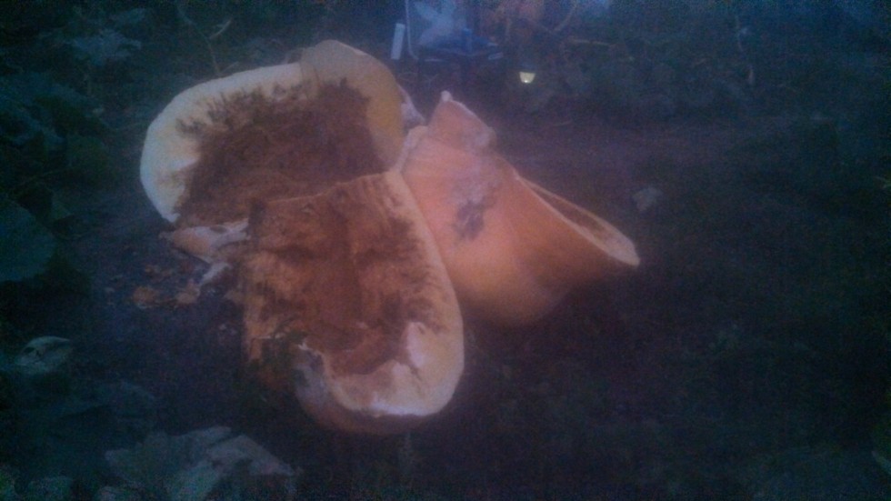 Note to self when cracked to center, cut up and get seeds right away, knat's were horrible grabbed a dozen seeds see what it looks like tomorrow. Estimated weight at time of death was 777