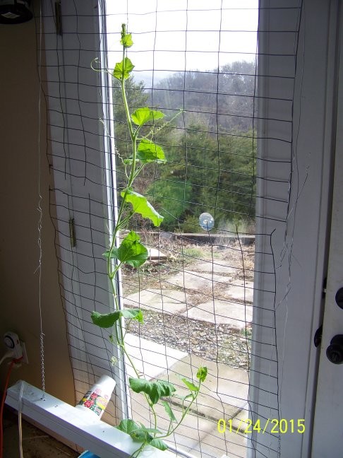 My winter long gourd. These things grow fast, about 4 inches a day inside with bad weather. Wow. My bushel gourd is just getting started to vine and was started the same day.