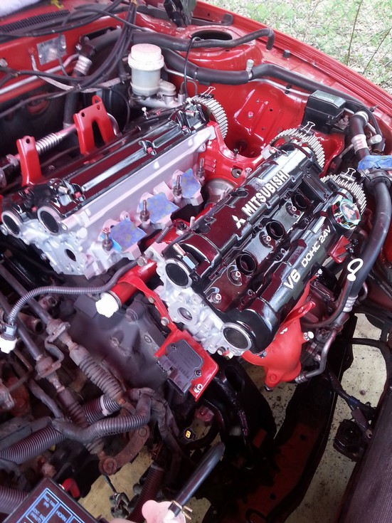 installed heads, valve covers, front and rear exhaust manifolds, spark module, rear cat, rear heat shields, rear (upper o2 sensor), water pump, lower intake plenum ( not pictured),. spent more time looking up torque specs....