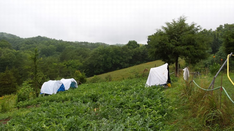 I love hoops houses in the garden. It means that these plants are set. It also gives the DEA helecopters fits ! LOL. I still have 3 plants that do not have melons set. Due to the heat, i can't get watermelons, only pears ! The heat is gone so maybe i can get the last plants done.