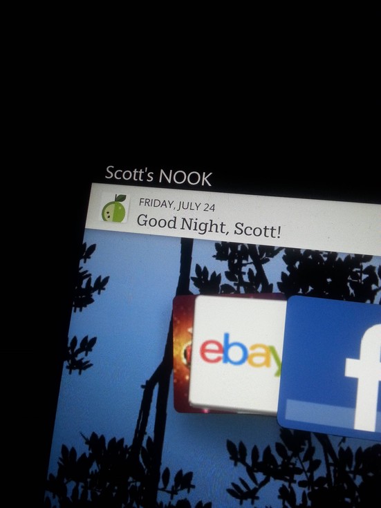 could not sleep, turned my nook on, apparently my nook was not in the mood... lol. tells me "good night scott". like I don't hear that enough!!!