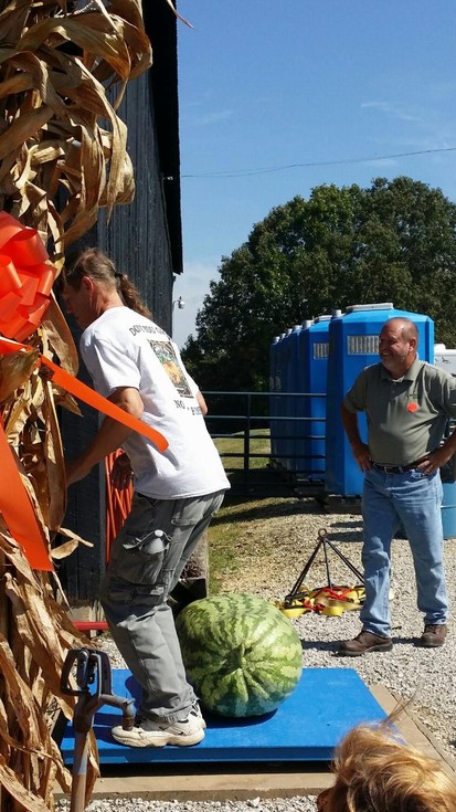 Here is the picture from Spencers story.. I'll let him tell it .. from his post... chris kent jumping around in the chaos but to sum up the story the scale read 232.0 when his melon first made it on the scale with the scale still settling it was SOOOO close he jumped on scale hoping it would round up that .5 of a pound... he jumped on the wrong side of the melon and thats how we ended up with the 231.5 kent. LOL Thats the way the melon crumbles ! I love weighoffs !!!