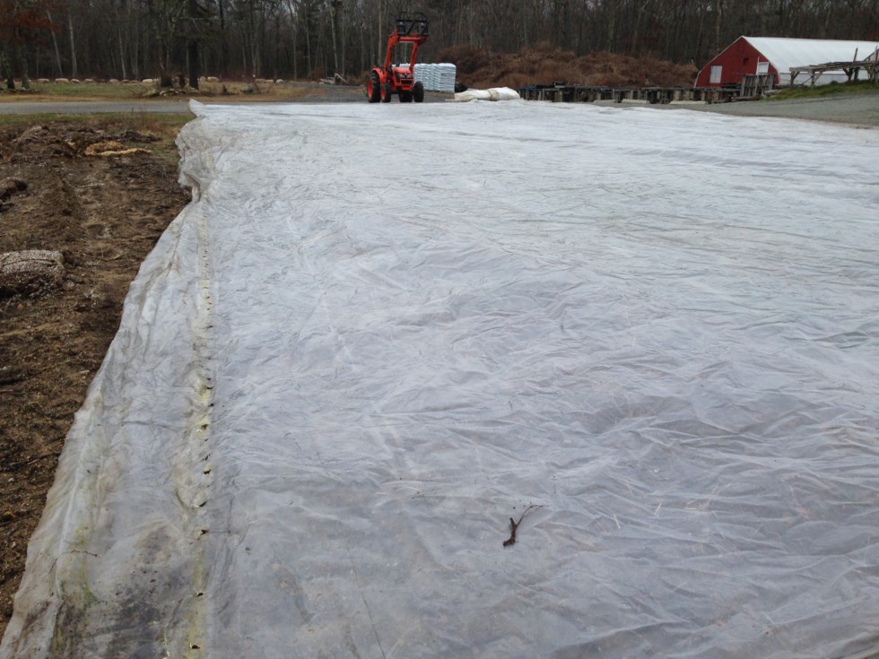 | This year we will try soil solarization on areas that will not be planted, in hopes of reducing our 3 year rest/rotation schedule to every other year.  After much reading about this topic we will do the following: Spring planting of Mustard, when the mustard flowers it will be chopped up, chicken compost will be added on top of the mustard.  Everything will then be tilled under and heavily watered to wet the soil down about a foot. After this is done we will cover the soil with 5 mil greenhouse plastic.  Cinder blocks will be used to anchor the plastic.  I scored 2- 40x100 sheets (shown in photo) for "free" when the greenhouse down the street was changing plastic.  Hopefully we will have a warm summer and I can bring soil temps under the plastic over 110 degrees for 2-4 weeks.  This "should" help with weed and pathogen suppression. |  |  |