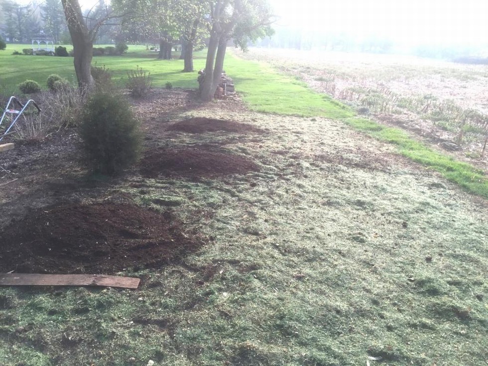 Mixed a full bag of commercial potting soil into each hill. Spread more fresh grass clippings. No sign of seed sprouting yet. 4 days. A bit nervous. Cold frame almost done for first hill.