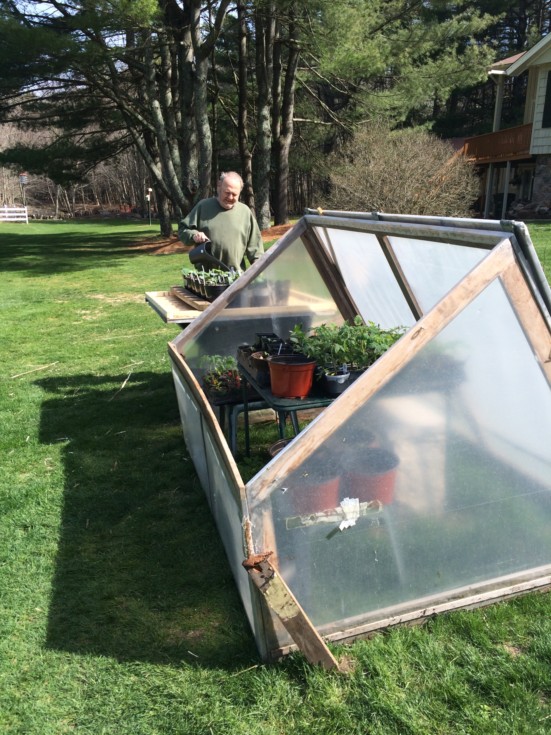 Pap tending to the seedling and his vegetable plants that he started from seed.