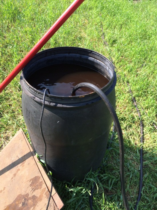 | For the first month of the season we water with a sump pump from this black barrel. Even with limited sun the barrel heat the water up quickly.  In the barrel for today's feeding was WOW Humic / Fulvic Acid, and Seaweed along with Calcium Nitrate and Epson Salts.  Because of the cool cloudy weather we are about a week behind, when its cool with limited sun we will hit them with the Cal Nitrate and Epson Salts. This combination will green the plants up in a day or so. In the 45 gallons of water we add 6 ounces Cal Nitrate and 6 ounces Epson Salts. The sump pump works well with the water wand as it gently waters the plants. |  |  |