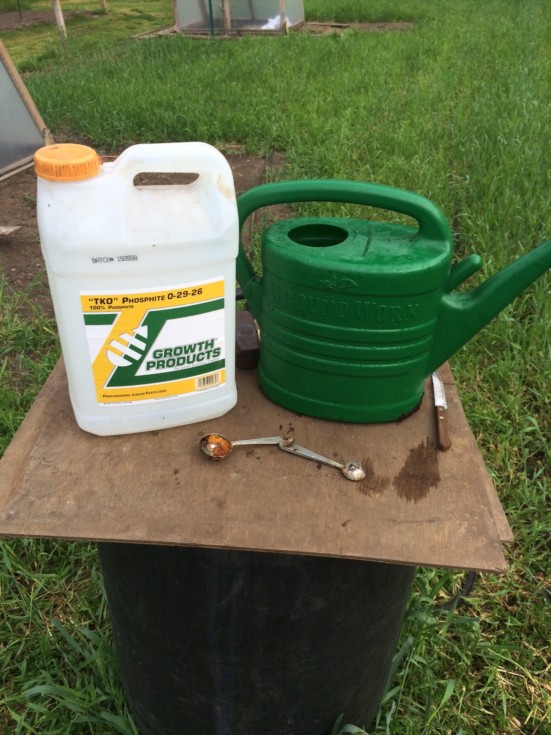 | I get many emails about the usage rate for TKO. TKO is a great product but it can be "hot". NEVER mix it with copper containing products. If I have applied copper I wait 20 days till a TKO application can be made.  After the application of TKO and if I need copper I wait 10 days before applying any more copper containing products. Per the label DO NOT use surfactants or adjuvants in with TKO.  Early in the season the drench rate on TKO is 1/4 ounce per gallon of water.  A tablespoon is 1/2 ounce so 1 tablespoon will added to a standard 2 gallon watering can.  From mid June till mid September we apply TKO at 3-5 ounces per 1,000 sq ft as a foliar application, depending on tissue test results we could also add 0-0-25 from Growth Products to this.  Last year after test results I was adding 2 ounces per 1,000 sq ft of 0-0-25 along with 3 ounces per 1,000 sq ft of TKO every 10-14 days depending on weather and pumpkin growth. |  |  |