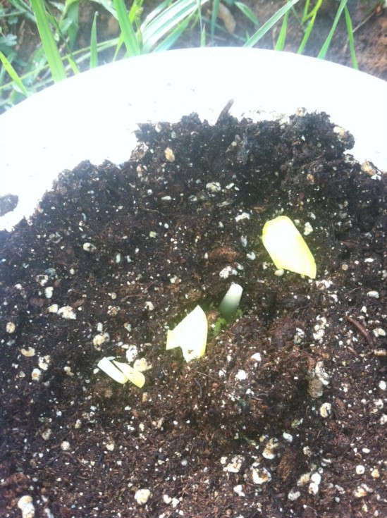 My bushel gourds sprouted while I was away so I set them out in the sun for about a half an hour. The crows came by and thought They were peanuts due to the color I guess like the ones I have been feeding them.