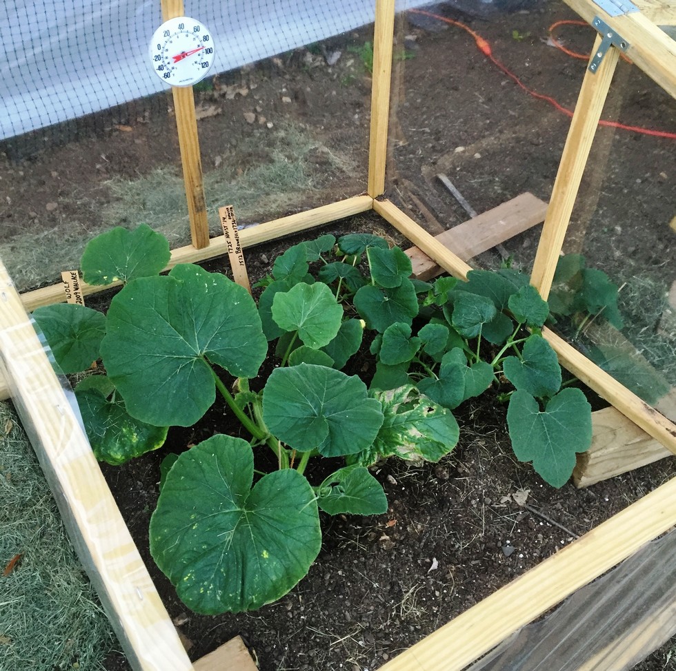 The 1725 Haist soundly outgrew the Grandpa Wallace and laid down today, and so first culling set for the morning - kinda liked a scheduled hangin'. Spaghetti squash outgrew the frame, and so I had to lift the base onto 2 x 4's to let the growing tip out. Great color. Watering daily, and every other day adding 1/4 strength fish emulsion and 1/4 strength seaweed solution. Temp here in Allentown at 8:15 pm is 86 deg - crazy. going to leave the frame top open and loop house ends open tonight for first time. Lowest temp expected 66 deg at 0600.