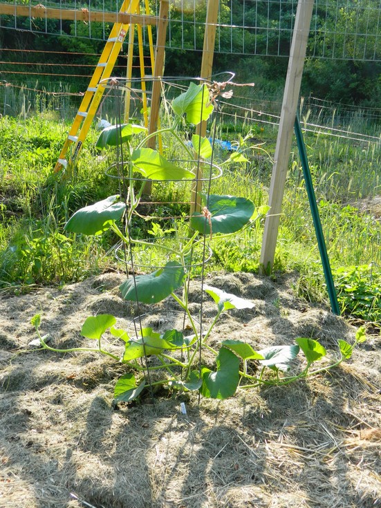 129 McWilliams long gourd. I'm going to try training s couple secondary vines along the ground to see if I can get them to root out. The gourd bed is well mulched with grass clippings. I have to add to it through the season as it deteriorates. The bagger on my John Deere riding mower makes that chore easy.