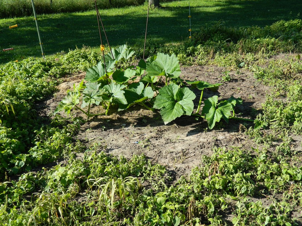 2 89McWilliams field pumpkins that did not get hit with spray. We plan to let one grow to the right and one to the left. The one to the left will have to cross a drainage ditch and grow into a small sweetcorn patch.