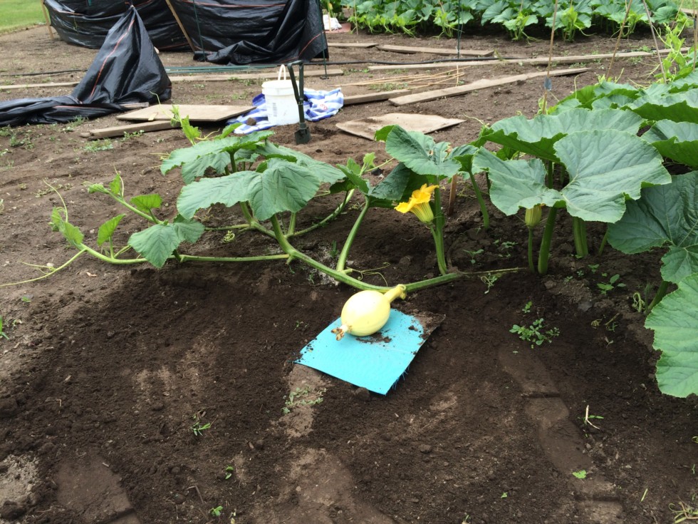 | As you can see the second pumpkin was culled, I removed the side vine right at the pumpkin and the one right after the pumpkin.  In my opinion these vines must always go as they get in the way when the pumpkin gets bigger.  We remove them right away and train other vines to fill the space, creating much needed space and air flow around the pumpkin.  The main vine is swung back as far as it will go  removing a few of the inside side vines) The area is then raked out to be as level as possible, removing any stones.  We will now grow every other side vine off of the main vine until all space is full (1,000 sq ft). |  |  |
