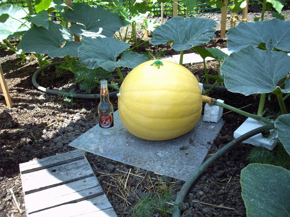 DAP 16 - readjusted the shade shelter to cover more of the plant and fruit. Need to bury more vines this evening. Sprayed with Sevin and Daconil since I already saw downy mildew in neighboring gardens. Very windy today and temps are on the move down this evening! Not much rain, so I need to haul some water.