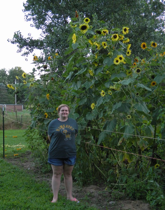 I planted a few decorative sunflowers in one corner of the garden. They were only supposed to get 5' to 7' tall. Jessica is 5'6", so you can see they grew a lot more than I expected. The soil was just fertilized like the rest of the pumpkin patch, mulched with grass clippings, and had no Pumpkin Pro added. I wonder what we could have grown if we used a really tall variety and mycorrhizae. We might have to give that a try next year.