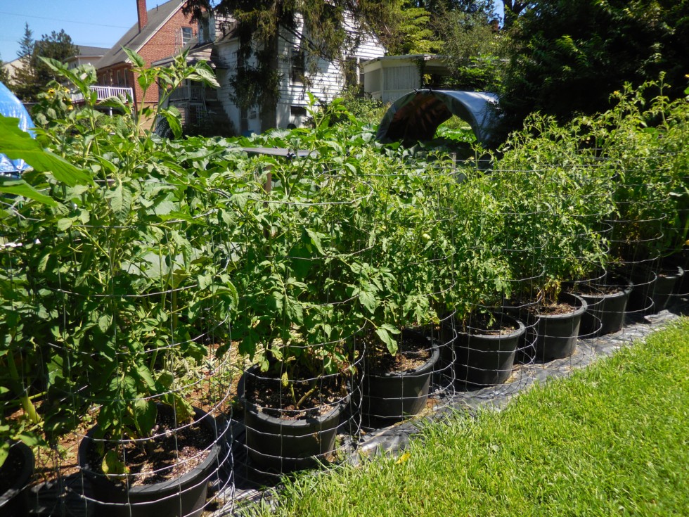 Tomato pots looking pretty good for no real soil and mostly rocks. They are heavy feeding starting last week ( a gallon of fish fertilizer we need to get rid of ) and also taking a lot more water.