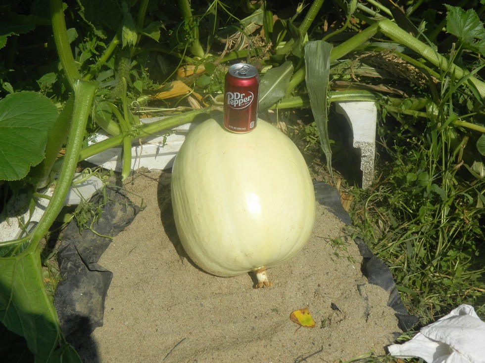 Look what the bees did for us on the 1965 Brandt. Judging by its size it must have pollinated around July 30, 2 months before weighoffs start. It is close to a drainage ditch and may be hard to load, but we will worry about that later. It is on the very back secondary that I ran to the edge of the plot, then turned to run parallel to the main. It is about 2 rows deep into the sweetcorn plot. It has a huge plant to feed it. We just let this plant go after the first pumpkin quit on us. I guess this is what you call a happy accident. We will take it.