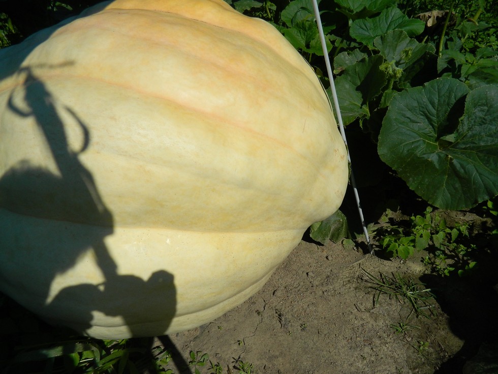 The 952.5 is growing slowly, at estimated 647# now. It averaged 11# a day over the past 4 days. Not bad for no stump. It will get some extra feedings too, It is growing a "nose" that is curling down over the blossom end. Not a typical pumpkin shape.