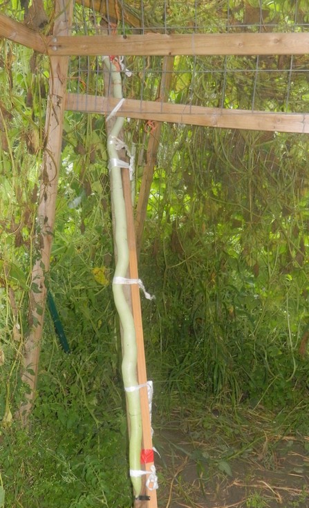Gourd on the 139.25 Ansems. Everything high on the trellis aborted, this 0ne set only about 6' off the ground on the far side. These skinny gourds are hard to keep straight on a slant board. We have a couple more that set later about 9' off the ground. If disease doesn't stop them they might do OK. But you can see from the brown leaves that disease is bad. Way too humid this year with real light winds. I think they need better air movement.