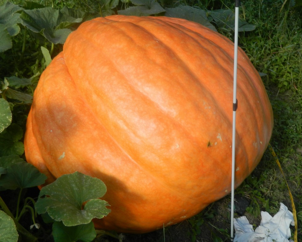 Here is the other pumpkin on the 1047.5. Est 831# gaining 7# per day. The cool nights and another 30# pumpkin on the plant slowed it down. This makes a total estimated 1375# between 2 pumpkins on one plant.