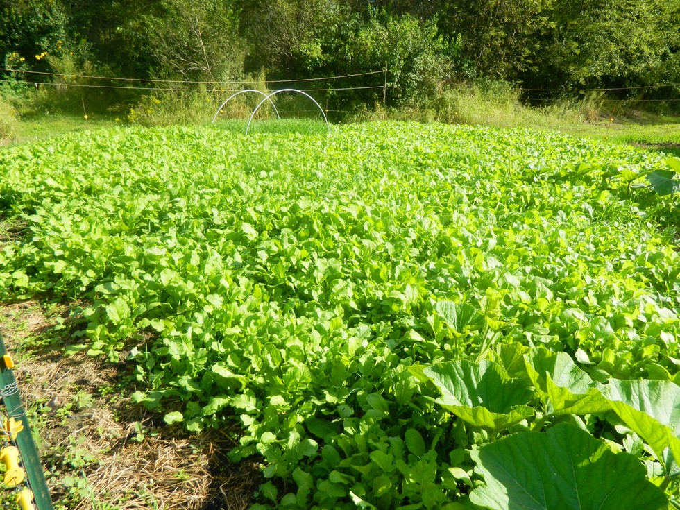 Cover crop where we lost a plant. Oats and Big Buck Brassica mix (forage brassica, dwarf Essex rape, purple top turnip and groundhog radish). After weigh offs we will open the fence to let deer in to eat it off. Last year we used rye and in the spring we had 6' tall plants in the electric wires. A mess to kill and pull out.