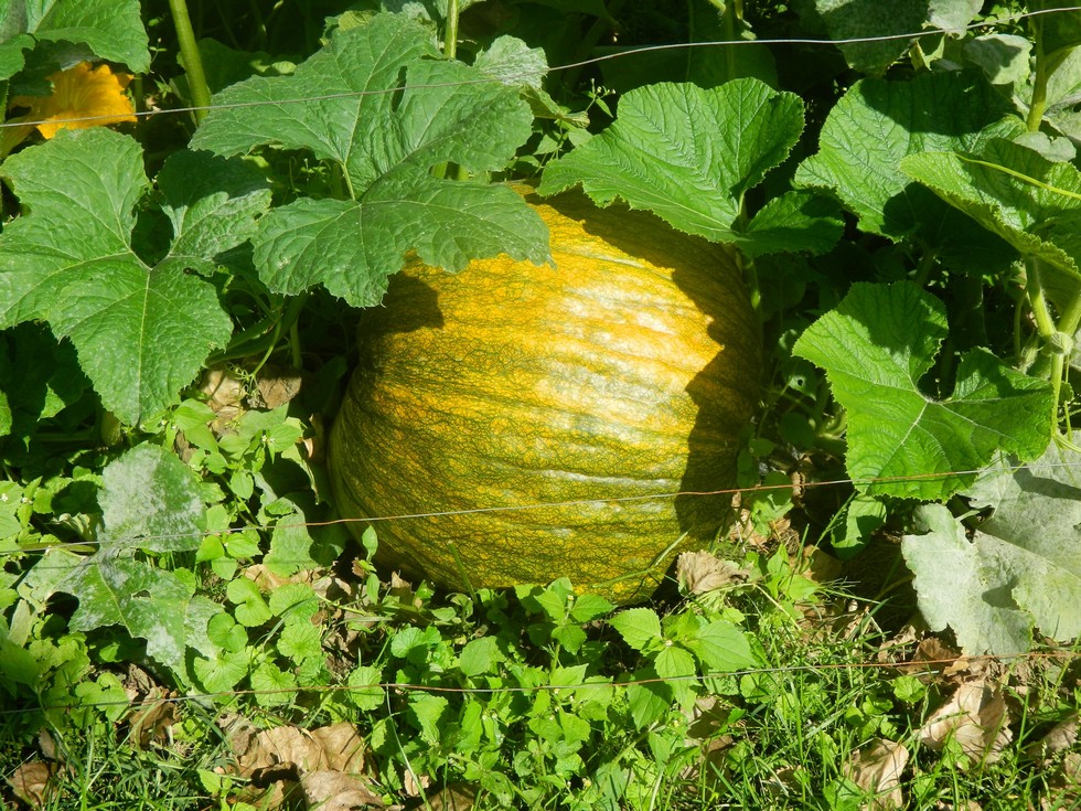 Another nice field pumpkin by the electric fence. I tried to carefully pull some weeds for the photo. I missed the 2 low wires but the one at deer nose height got my shoulder. 20 minutes later I still feel it all the way down to mu finger tips.