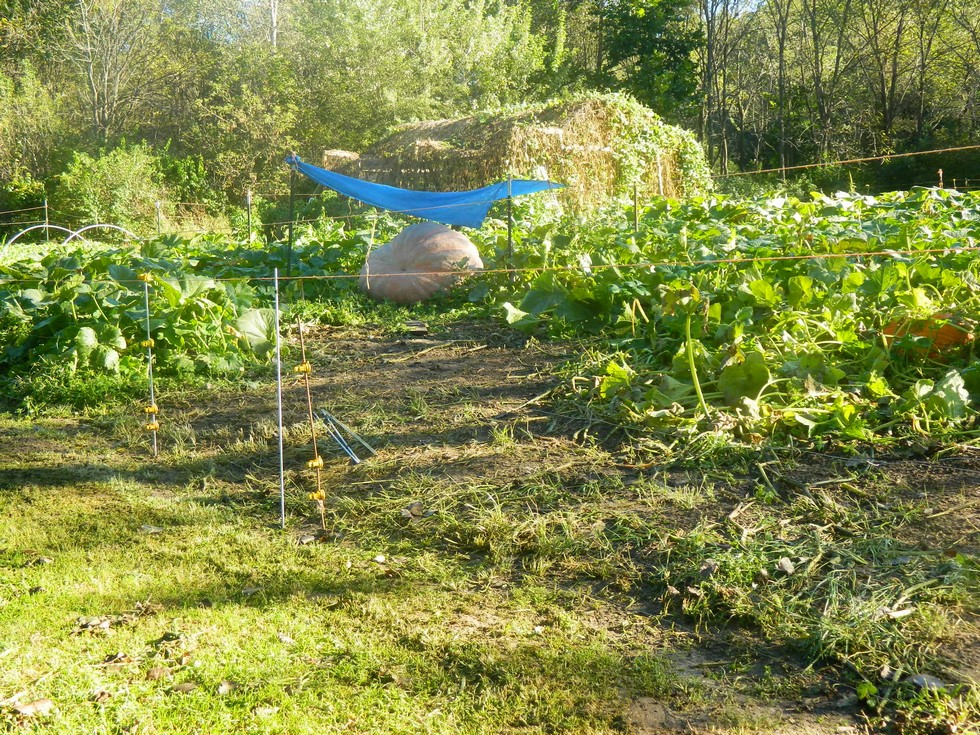 We are getting a break in the wet weather, so I tried to get ready for loading the 1818 on Friday. I pulled out some useless vines and mowed off the remaining few weeds. I want to get the sun and breeze to dry the soil some so we don't tear up the patch too much. Since this pumpkin quit growing, it stays under the shade tarp and gets no blanket to keep it cool. It was down near 40 this AM.