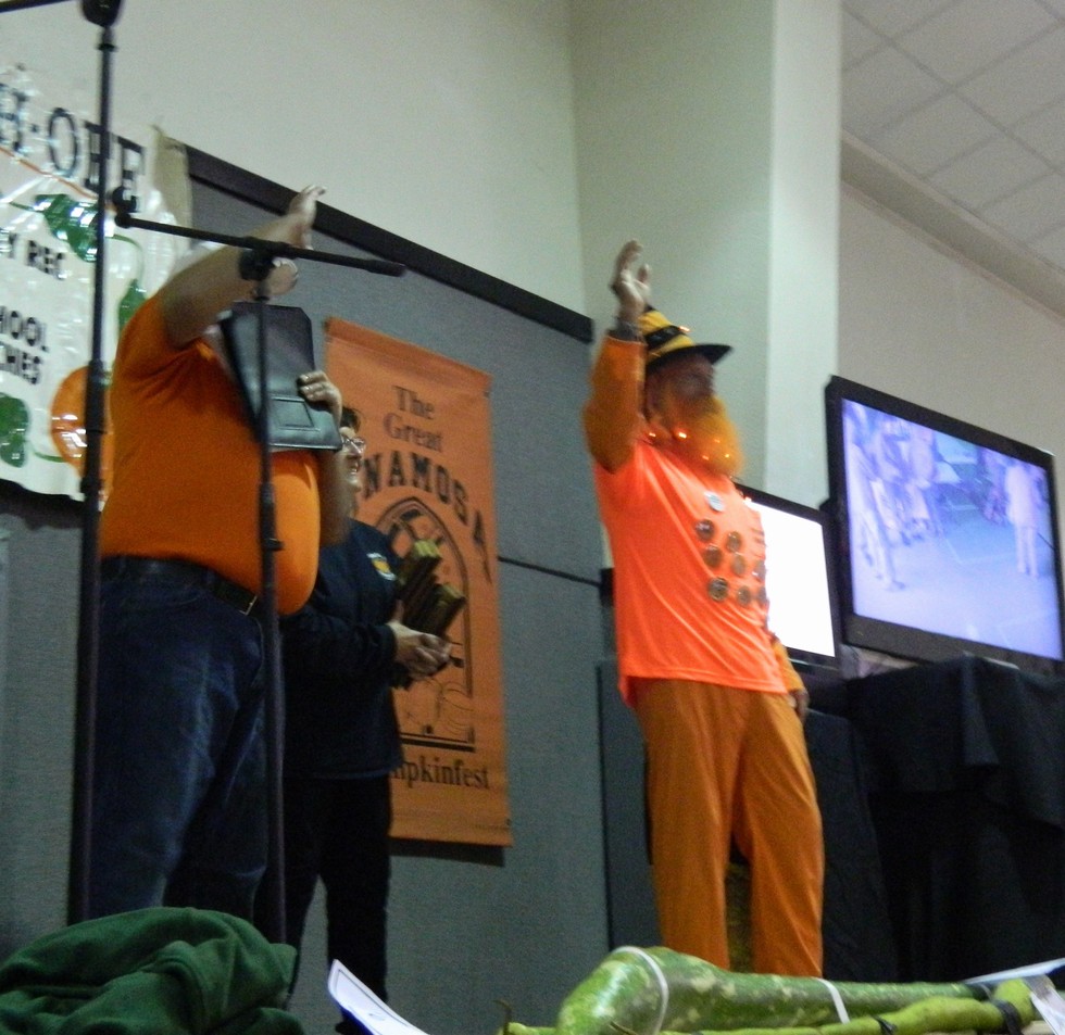 Pumpkin Master John Dirks received a well deserved award, being inducted into the Ryan Norlin Pumpkin Weighoff Hall of Fame. John has run the forklift flawlessly forever and really gets into the spirit. I don't know if the phoyo shows it, but his costume includes flashing orange lights.