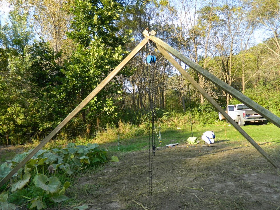 I didn't take any chances when we lifted the remaining pumpkins. My prize for 2nd place field pumpkin was a $50 gift card to Theisen's Farm and Home store, and they had a new 2 ton hoist for $60.00. It has a better gear ratio, so it is easier to lift the big ones.