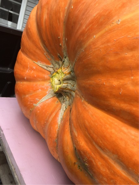 Hooked up my truck to pull the tractor and pumpkin out of the garden. This didnt go so well and dropped the pumpkin from about 12 inches. Damage done broke the stem.