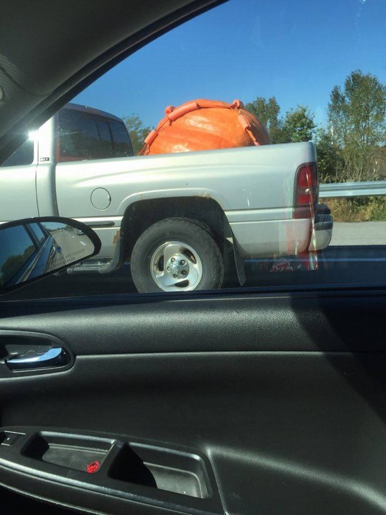 My wife and daughter had fun watching the cars on I-80 pulling up beside us to take pictures. One of Pumpkinman Dan's friends snapped this photo and sent it to him. He forwarded on to me to see if it was us. Yep. That's my truck and my pumpkin with Jacob driving. I was following behind in the Ford Ranger hauling Jacob's pumpkin. Even a state trooper had to get out his phone and snap a picture. Lots of photos and questions at the gas, food and rest stops. Some of the best fun of big pumpkins is all the smiles it puts on people's faces.