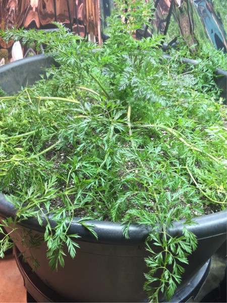 Yes Master P giant carrots are fun to grow. The outdoor carrot that was transplanted from a six inch diameter tube seems to like its new home. I have spent the morning rearranging the pots and lights. I will have two carrots indoors, both in 65 gallon pots. Each will be under a 600 watt metal halide light. I have moved the tomatoes over to LED since same start date tomatoes are throwing mega-blossoms under LED light and the ones under MH light were not. Since i do not want the carrots to flower this seems to be the best match. I am very curious to see how long I can keep this May germinated carrot from going to seed. My second large pot still has a breeder tomato in it but before January I am going to try to set it up for next year utilizing what I learned last year. I am currently considering a multi-depth drip irrigation system with a water chiller for keeping the soil cool.
