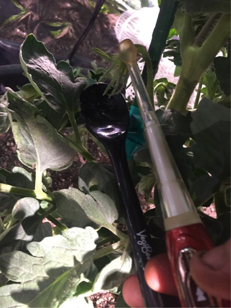 A former outdoor tomato grower emailed me asking how we pollinate the indoor plants. I thought it was a good question so this is a picture how i do it. I use a device meant just for pollination. It is called a vegibee. It vibrates a bit faster than an electric toothbrush similar to frequency of a bees wings. When the flower opens i vibrate the blossom on it's side for about 4 seconds three time per day. I place a spoon under the blossom to see how much pollen is dropping. If it drops a lot, i will sometimes attempt to manually add pollen to the stigma of the flower. How do you electric toothbrush users do it?