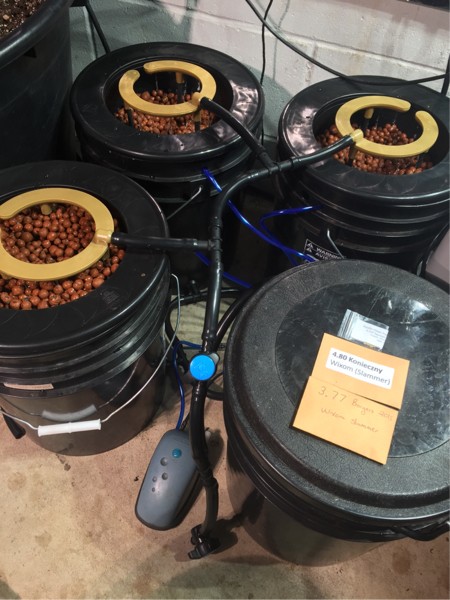 Have the first of the DIY hydroponic buckets connected. Spent some time this morning trying to decide what seeds to put in them. I have 3 buckets and I also have seeds from 3 different Wixom Slammer plants. They are the 4.8 Konieczny, the 4.24 Spaziani, and 3.77 Borgers. It is going to be the Wixom Slammer showdown. Same environment, same nutrients. I think it will be interesting to compare growth characteristics.