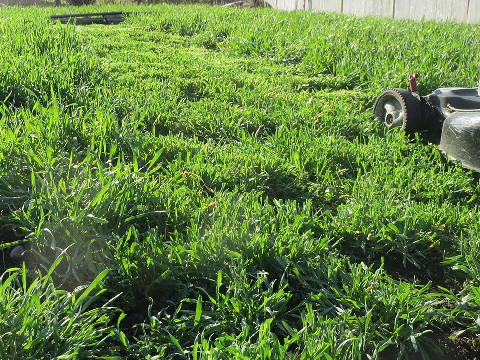 This cover crop was planted on Sept 1 last fall. Johnny's Fall Green Manure Mix. I blasted it with Ammonium Calcium Nitrate in mid- Sept and a good dose of ureamate in early October. The winter rye seems to have loved the mild winter and the cool wet spring. I mowed this crop as low as I could on Feb 24 and again today. Cuttings removed to the mulch pile and tiller ready.
