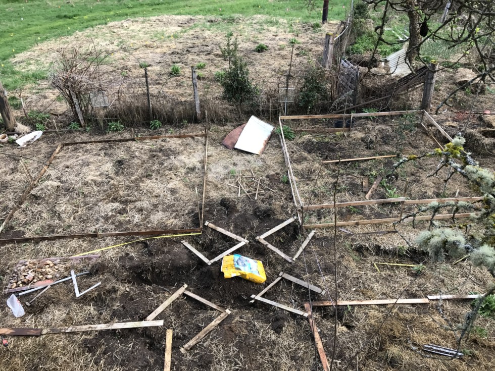 I'll have up to four identically shaped patches in the end, but as of now I have not planted or fully completed any of them yet and in fairness to the "only one patch" rule I will declare now that my 150 sq ft competition entry will be grown in the only area with both lower and upper railing--in this picture it's the area in the upper right corner. This will be my competition patch. It will be easy to distinguish because it has a cherry tree growing in it and some other small shrubs too. And I don't think any of the the other patches will get the upper second railing.