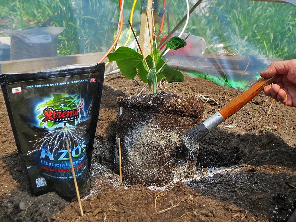 Many thanks to the Wallaces and the SNGPG for the opportunity to plant this great 2009 seed. Here I am using a soft paintbrush to "dust" the rootball with AZOS in preparation for planting. Nice way to get direct root contact.