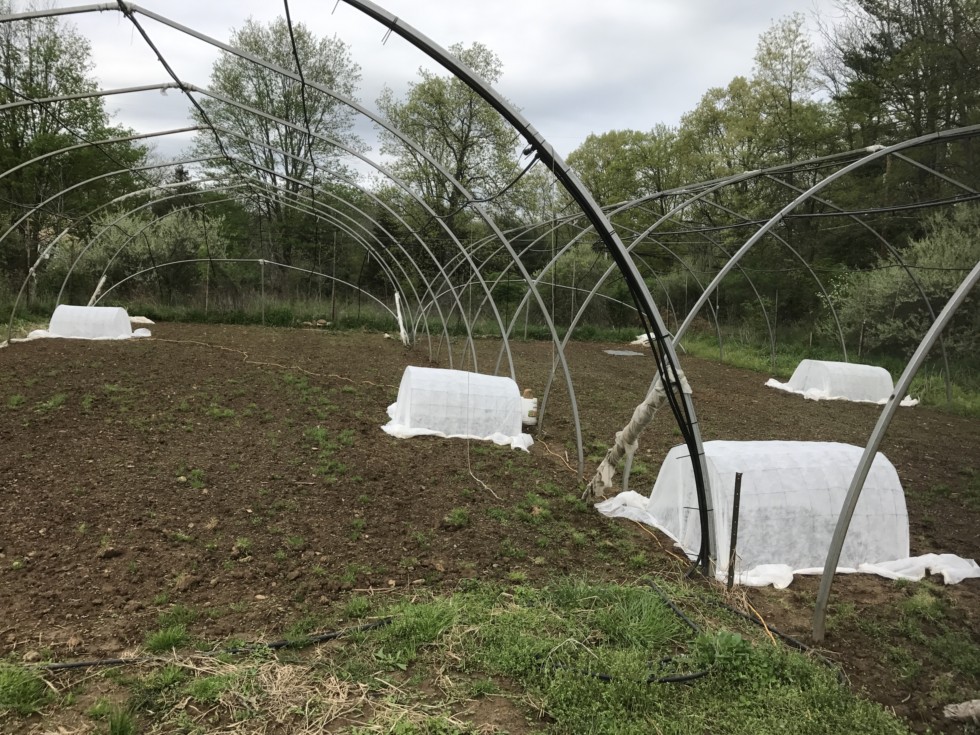 All 4 giant pumpkin plants went in the ground yesterday, April 30th. Couple of chilly nights coming up in the forecast over the next week but shouldn't go below 40 (I hope). Anyway they are all covered as always, and 2 have heating cables so they'll be fine