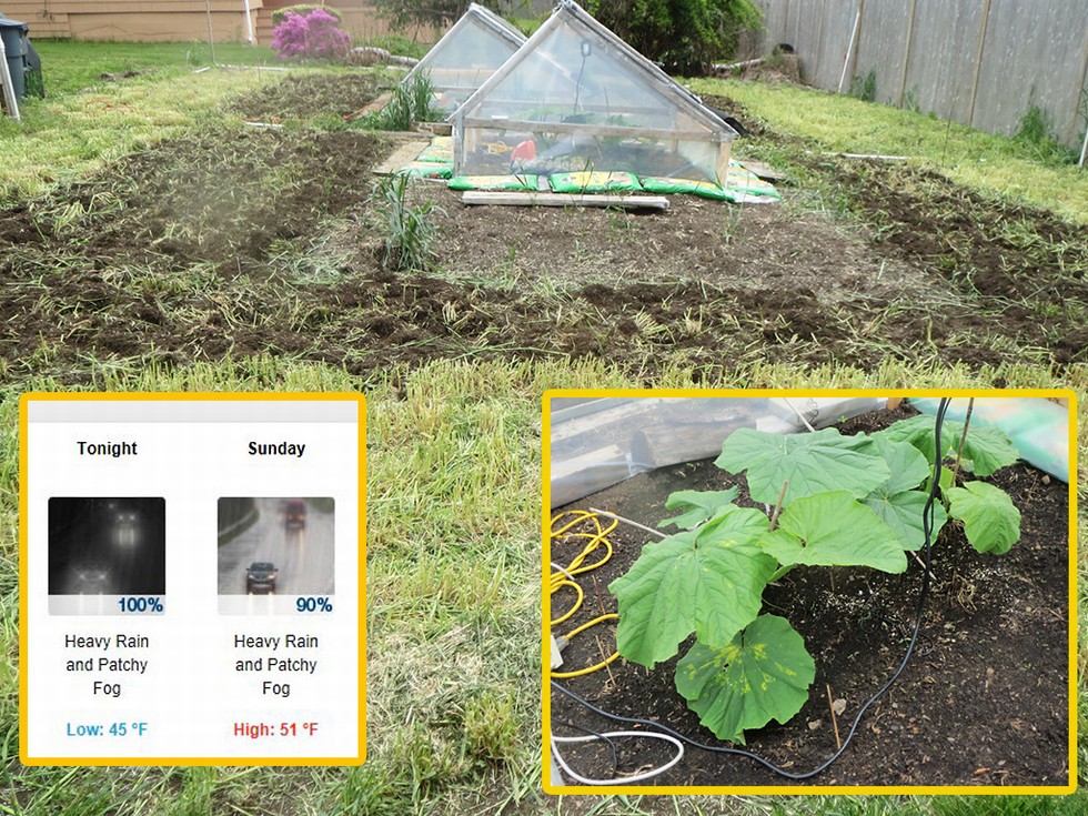 I am trying amending and tilling in 3 sections this season. First section done on April 11 in and around greenhouses. We are expecting some heavy rain so I tilled the second section ahead of the rain today and amended with gypsum/composted chicken manure/kelp meal and crab meal. Let mother nature soak that stuff in. Will add the more soluble stuff next week when the weather is expected to improve significantly here. Plants are growing slowly. Here you see a pair of 2145 plants that have been outside for 13 days now.