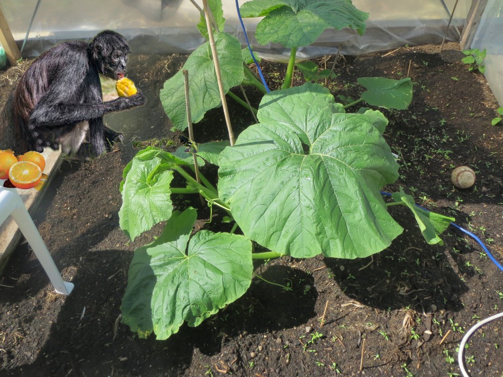 Here you see my weeding assistant having a snack after weeding the 2009 this morning. As you can see the monkey is trained to sit on the walkboards.