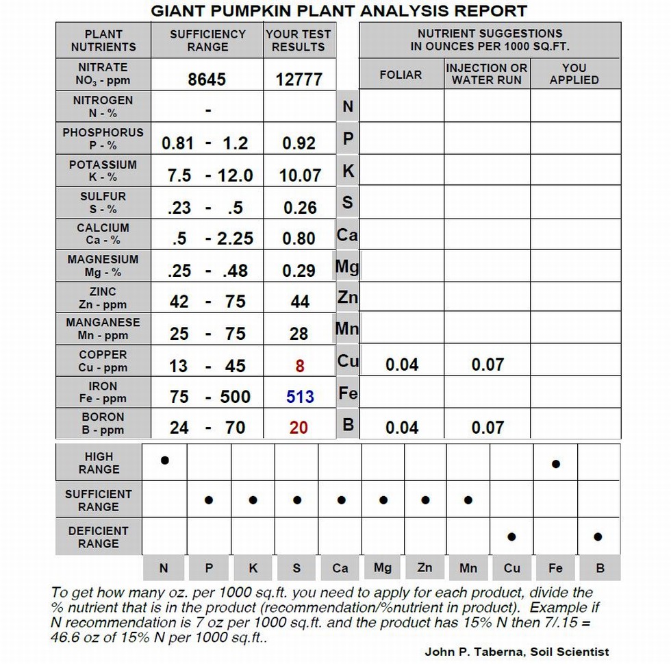 This is a tissue test I received today from a 2145 plant 3 weeks after planting outdoors. Believe me when I tell you that this is a major accomplishment for me. Very pleased to see the plants getting the "right" balance of nutrients. Boron is always hard to retain in my soil. I was anxious to get an early look to answer 2 important questions. I have been trickling in Ureamate at a rate of 3 grams per greenhouse (almost) every day since day 5 outside. The results tell me that that rate is not too much. Also, magnesium, manganese and boron are chronic problems for me and hard to retain in the soil. The test tells me that I can continue with the Ureamate and supplement additional Mg, Mn and B.