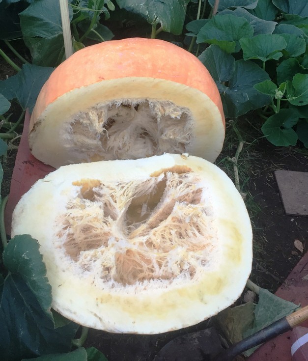 Culled the 1495 today- still was a beauty when viewed from the flower end, but a rot from the stem that literally fell out on to the dirt. Wife not happy assisting in wheel barrelling heavy, mushy chunks into the corn field - maybe the deer will be happy. So not much left of the season - 2 stalled 125 pounders on the 2014 and an ugly (but growing) 10 pounder resembling a Tom Brady football on the 2624. Anybody out there have anything resembling success on the 2624?