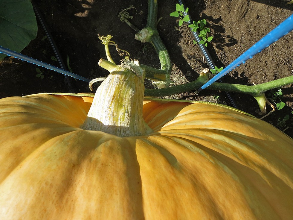 Today I waited for 85 degrees+ and tugged for the third time on the 2009 pumpkin to move it out about 3 inches. I think the stem stress is relieved. You can see some nice color developing.