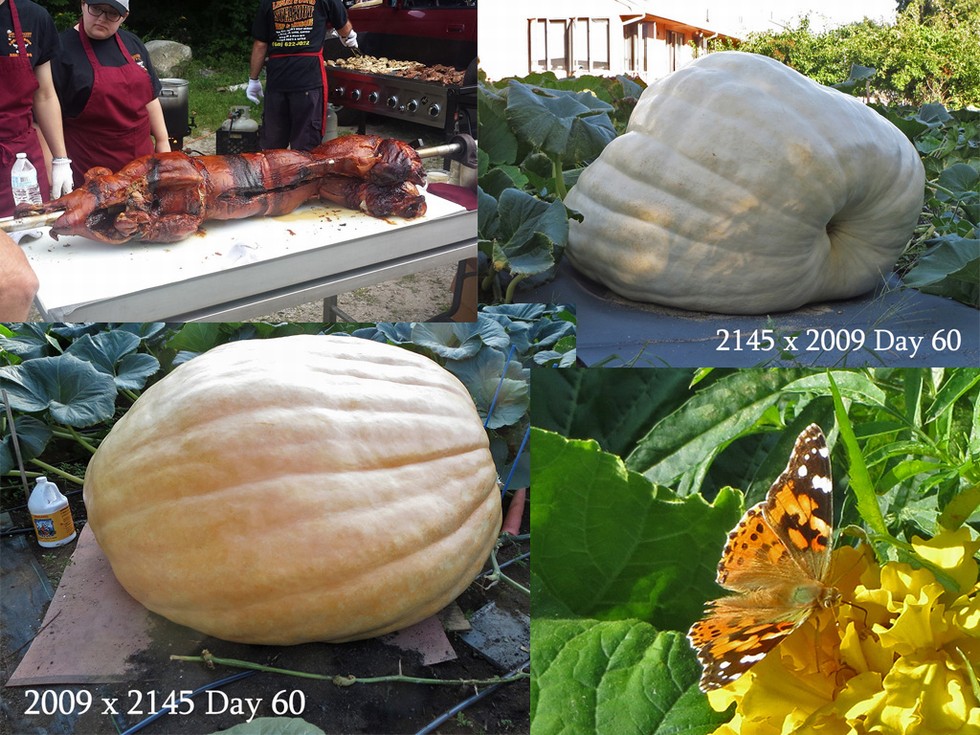 Wednesday hump day update. I want to thank the New Hampshire growers (NHGPGA) for a great time last weekend hosting the New England picnic. Great time to see friends and make new ones. You can see just some of the feast that we all enjoyed. If you are a vegetarian, you might want to move along to the next post. 2009 x 2145 was at day 60 on Monday and is at 1400+. Today was day 60 for the 2145 x 2009. 680 lbs and no sign of any orange. Not the size or shape that the 2145 is capable of producing. Oh well. Weather is getting cooler and things are slowing down except for the butterflies. They are lovin' the marigolds.