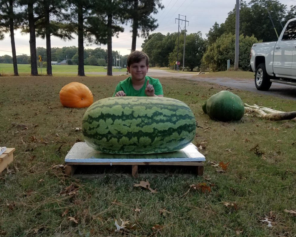 Paxton and his 1st place melon at Pumpkin Daze in Republic Missouri. 182.5 Lindley (318.5 Kent x self)