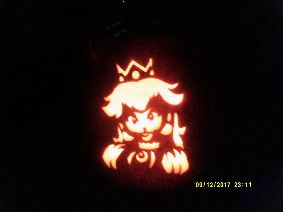 Princess Peach from Super Mario My neighbors kid was looking at my pumpkins when she spotted this one and the last 4 , looked up at me and said "you're getting better every year". I guess fancy doesn't always mean better.
