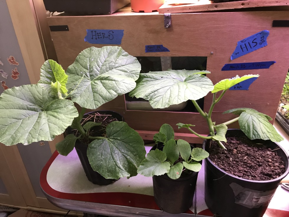 Plant on the left is about a month old. Plant on right is a few days older and yet lagging a little behind... Vine on left is about 10-12�. It will need support/to be planted within a few days.